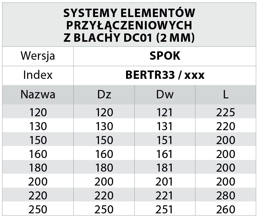 Metalowe systemy elementów przyłączeniowych z blachy czarnej wykonane są z blach stalowych DC01 o grubosci 1,0; 1,2; 1,5; 1,8; 2,0 [mm].